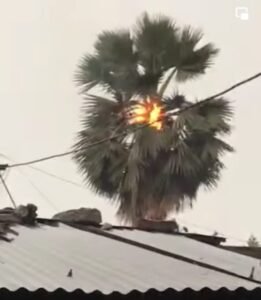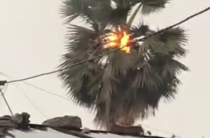 तार के लंबे पेड़ पर गिरा ठनका, पेड़ में लगी आग