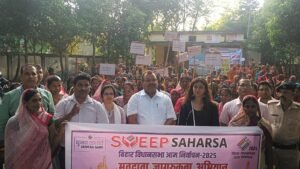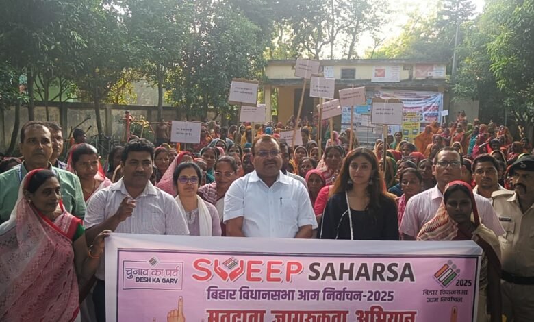 सहरसा:-बिहार विधानसभा आम निर्वाचन 2025 के दृष्टिगत 75-सहरसा विधानसभा निर्वाचन क्षेत्र अंतर्गत सौर बाजार प्रखंड में स्वीप अंतर्गत मतदाता जागरूकता कार्यक्रम चलाया गया। कार्यक्रम को संजय कुमार निराला वरीय पदाधिकारी स्वीप कोषांग सह उप विकास आयुक्त सहरसा जिला स्वीप आईकॉन सुश्री संचिता बसु एवं वैभव कुमार नोडल पदाधिकारी स्वीप कोषांग सह निदेशक डीआरडीए सहरसा के द्वारा शुभारंभ किया गया।          वरीय पदाधिकारी स्वीप कोषांग के द्वारा कार्यक्रम मे सभी मतदाताओं से अपील किया गया कि आप सब अपने अपने स्तर से भी जागरूकता अभियान चलाए, छठ महापर्व मे जो लोग अपने घर आए है उन सबको जागरूक कीजिए की दिनांक 06/11/2025 को मतदान के दिन अपने मत का प्रयोग करके ही जाए इसी क्रम मे सुश्री संचिता बसु के द्वारा कार्यक्रम में आए मतदाताओं/आम लोगो से अपील किया गया कि लोकतंत्र के इस महापर्व मे आप लोग अपनी भागीदारी सुनिश्चित करें, दिनांक 6/11/2025 को होने वाले मतदान मे आप सब जरूर से जरूर अपने मतदान केंद्र पर जाकर अपने बहुमूल्य मत का प्रयोग करें उनके द्वारा कहा गया कि आप अपने मत के महत्व को समझिए आपका एक मत आपका भविष्य बदल सकता है इसलिए आप जरूर अपना मत का प्रयोग कार्य कार्यक्रम के क्रम मे ही श्री वैभव कुमार नोडल पदाधिकारी स्वीप कोषांग सह निदेशक डीआरडीए सहरसा के द्वारा भी लोगों को मतदान के प्रति जागरूक किया गया उनके द्वारा लोकतंत्र मे मतदान की अहम भूमिका पर प्रकाश डालते हुए कहा कि “हर वोट लोकतंत्र की शक्ति है, और हर मतदाता का योगदान देश के भविष्य की दिशा तय करता है।    कार्यक्रम के दौरान वरीय पदाधिकारी स्वीप कोषांग सह उप विकास आयुक्त सहरसा के द्वारा मतदाताओं को मतदाता शपथ दिलाई गई तथा सुश्री संचिता बसु एवं वैभव कुमार नोडल पदाधिकारी स्वीप कोषांग सह निदेशक डीआरडीए सहरसा के द्वारा पद यात्रा निकालकर लोगों को मतदान के प्रति जागरूक किया गया कार्यक्रम मे डीपीओ ICDS, डीपीएम जीविका, स्वीप कोषांग के अभिषेक, विकाश भारती,किशोर कुमार, चंद्रभाल ओमजी, प्रिंस गौरव, प्रणव प्रेम तथा हजारों की संख्या मे मतदाता मौजूद रहे।